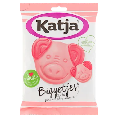 Wie kent ze niet? De overheerlijke Katja Biggetjes. Zachte fruitgums met olijke oortjes in de smaken aardbei, framboos en kers. Deze watertandend lekkere combinaties zijn gemaakt met echt fruitsap. Die laat je niet lopen, dus pak ze bij de oren en geniet!