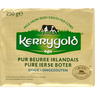 Weidemelk. De puur natuur Kerrygold boter is gemaakt van Ierse weidemelk afkomstig van koeien die vrij in de natuur grazen gedurende bijna 24 uur per dag, 7 dagen per week en dit tot 300 dagen per jaar. Deze melk is natuurlijk rijk aan bètacarotten, die de Kerrygold boter zijn gouden kleur geeft. Perfect voor smeren, bakken en braden - ontdek de romige smaak!.