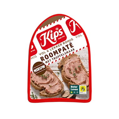 Kips Roompaté met truffelsmaak is een volle en romige paté met een heerlijke truffelsmaak. Voorzien van het 1 ster Beter Leven keurmerk van de Dierenbescherming. Het product is verpakt in handig hersluitbaar kuipje. Heerlijk voor op brood, maar probeer het ook eens op een toastje of als voorgerecht.