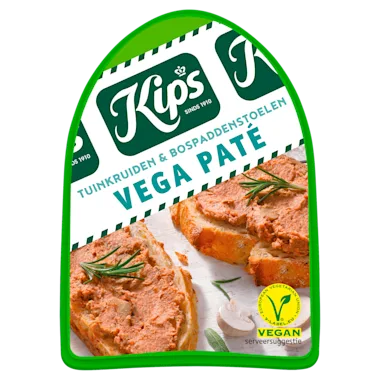 Kips Vega Tuinkruiden en Bospaddenstoelen Paté is gemaakt op basis van soja- en erwteneiwitten en is 100% plantaardig.