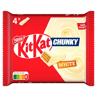 NESTLÉ KITKAT CHUNKY White multipack bestaat uit 4 KITKAT CHUNKY chocoladerepen, gemaakt van krokante wafel omhuld met een verrukkelijke laag witte chocolade. Have a break, have a KitKat®.