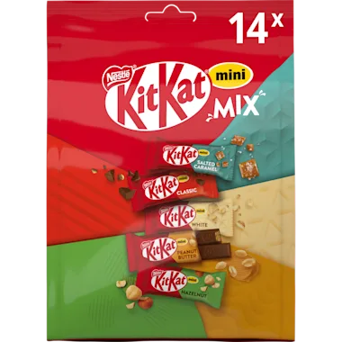 NESTLÉ KITKAT MINI MIX is een mix van mini chocoladerepen gemaakt van krokante wafel omhuld met een verrukkelijke laag chocolade in vijf heerlijke smaken. Have a break, have a KitKat.