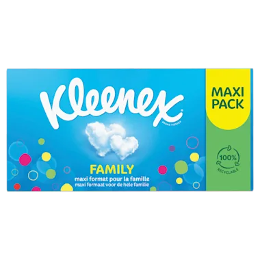 Kleenex Family Maxi tissues zijn gemaakt voor dagelijks gebruik voor het hele gezin. Ze zijn zacht én sterk. In een handige grootverpakking.