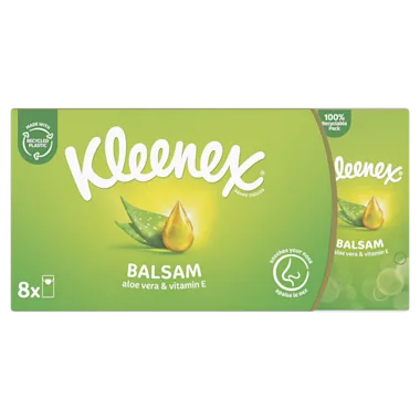 Kleenex Balsam zakdoekjes bevatten een laagje verzachtende calendulabalsam. Dat voorkomt een rode, schrale neus bij verkoudheid en griep. Ook verkrijgbaar als tissues.