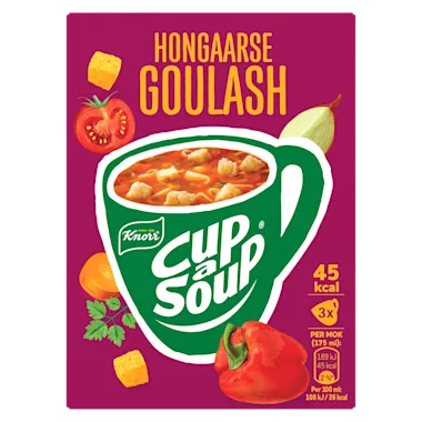 Knorr Cup-a-Soup Hongaarse Goulash is snel en makkelijk klaar te maken. Het is een heerlijke goulashsoep met croutons, maar ook met smaakvolle groenten. Even toe aan een boost? Cup-a-Soup is jouw perfecte pauzemoment. In een handomdraai geniet je van een heerlijk romige soep, boordevol smaak. De knapperige croutons zorgen voor die extra bite en maken elke slok tot een smaakbeleving. In één verpakking zitten 3 zakjes Cup-a-Soup, individueel verpakt. Een zakje van deze heerlijke Knorr Cup-a-Soup Hongaarse Goulash bevat slechts 45 calorieën per mok. Daarnaast bevat deze soep geen kunstmatige kleurstoffen, toegevoegde smaakversterkers en conserveermiddelen.