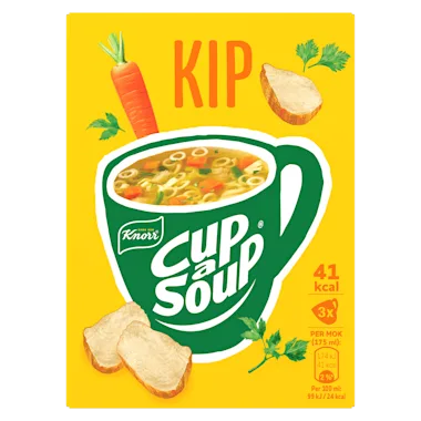Over Knorr Kip Cup-a-Soup: Knorr Kip Cup-a-Soup is snel en makkelijk klaar te maken. Het is een heerlijke kippensoep vol stukjes malse kip, maar ook met smaakvolle groente als wortel, prei en peterselie voor een optimale smaak. Zoals je van ons gewend bent, besteden wij veel zorg en aandacht aan ons recept en gebruiken wij alleen de beste ingrediënten om de goede smaak te waarborgen. In één verpakking zitten 3 zakjes Cup-a-Soup, individueel verpakt. Een zakje van deze heerlijke Knorr Kip Cup-a-Soup bevat slechts 41 calorieën per mok. Daarnaast bevat deze soep geen kunstmatige kleurstoffen, toegevoegde smaakversterkers en conserveermiddelen. Bereidingswijze: De soep is eenvoudig en snel te bereiden, doe de inhoud van het zakje in jouw favoriete mok en giet er 175 ml kokend water bij. Daarna eventjes roeren, 1 minuutje wachten en klaar om te eten. Genieten maar! Over Cup-a-Soup: Heb je behoefte aan een hartig momentje tussendoor? Cup-a-Soup is een snelle en makkelijke keuze voor elk moment van de dag. Of je nu thuis bent, op kantoor of onderweg — een warme mok Cup-a-Soup geeft je de boost om weer door te gaan. Cup-a-Soup is een hartig tussendoortje dat je helpt om even op te laden. Met een breed assortiment aan smaken is er voor ieder wat wils. Van vertrouwde klassiekers zoals Tomaat, Kip en Champignon Crème tot verrassende varianten zoals Indiase Kerrie, Franse Ui, Asperge en Mosterd — een ruime keuze uit smaken die precies aansluiten bij jouw behoefte. 4 uur Cup-a-Soup, dat zouden meer mensen moeten doen!