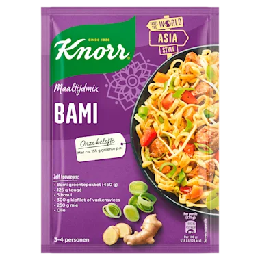 Ontdek de Knorr Bami Maaltijdmix, een snel en makkelijk gerecht. Laat je inspireren door Knorr en zet de lekkerste gerechten met gemak op tafel. Proef de wereld, Aziatische stijl. Zo bevat deze maaltijdmix ca. 155 gram groente per persoon. Deze mix bestaat uit zorgvuldig gedroogde en gemengde kruiden en specerijen. En uiteraard zonder conserveermiddelen, kunstmatige kleurstoffen en toegevoegde smaakversterkers.