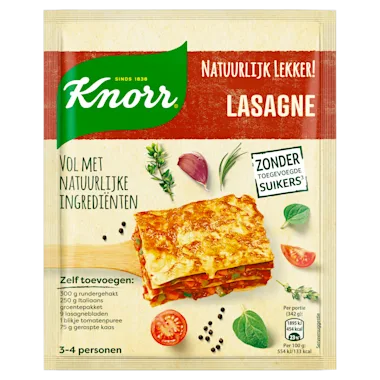 De Knorr Natuurlijk Lekker! Lasagne Maaltijdmix is onderdeel van de Knorr productlijn die bekend staat om het gebruik van natuurlijke en pure ingrediënten en kruiden. Deze maaltijdmix is geschikt voor veganistisch gebruik. De ingrediënten zijn zorgvuldig geselecteerd.