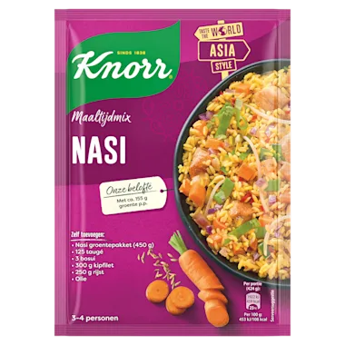 Ontdek de Knorr Nasi Maaltijdmix, een snel en makkelijk gerecht. Laat je inspireren door Knorr en zet de lekkerste gerechten met gemak op tafel. Proef de wereld, Aziatische stijl. Zo bevat deze maaltijdmix ca. 155 gram groente per persoon. Deze mix bestaat uit zorgvuldig gedroogde en gemengde kruiden en specerijen. En uiteraard zonder conserveermiddelen, kunstmatige kleurstoffen en toegevoegde smaakversterkers.