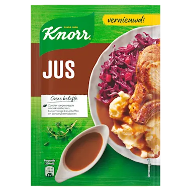 Knorr Vleesjus is een heerlijke jus. Deze jus is extra lekker bij een stukje vlees, zoals karbonade of schnitzel. Aangezien wij bij Knorr eerlijk en goed eten belangrijk vinden, heeft onze jus geen toegevoegde smaakversterkers, geen kunstmatige kleurstoffen en geen conserveermiddelen. Door echte en natuurlijke ingrediënten te gebruiken, heeft onze jus een heerlijke smaak. Door de jus in een droge vorm te bewaren, blijven de ingrediënten veel langer goed. Dit is een natuurlijke manier van conserveren en hierdoor hoeven er ook geen conserveermiddelen aan de jus te worden toegevoegd. Zo houden we ons eten zo eerlijk en gezond mogelijk. Knorr Vleesjus is speciaal gemaakt voor bij een stukje vlees. De kruiden die in de jus verwerkt zitten, geven je vlees een lekkere smaak. Knorr Jus is makkelijk te bereiden: je hoeft alleen wat vloeibare boter en water toe te voegen en je hebt binnen een minuut een heerlijke jus voor bij je vlees. Snel en makkelijk te bereiden.