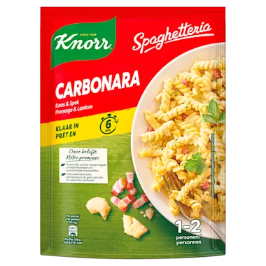 Al sinds 1838 was Carl Heinrich Knorr al aan het experimenteren met het drogen van kruiden en groenten. Dit was volgens hem de manier om de smaak en voedingswaarde te behouden. Zijn missie was om koken voor vrouwen zo gemakkelijk mogelijk te maken, zonder dat de kwaliteit van het eten achteruit zou gaan. Vanwege de rijke historie en de invloed van chefs van over de hele wereld is culinair vakmanschap een kenmerk van Knorr geworden. Knorr is altijd op zoek naar nieuwe innovatieve producten, die het koken eenvoudiger kunnen maken. Een voorbeeld hiervan zijn de Knorr Spaghetteria gerechten. Knorr Spaghetteria gerechten bestaan uit pasta met een lekkere saus en zijn heel snel en gemakkelijk te bereiden. Voor wanneer je zin hebt in een makkelijke en smaakvolle maaltijd! Een gerecht zonder toegevoegde smaakversterkers, kunstmatige kleurstoffen en conserveermiddelen. Het gerecht is klaar te maken in de pan door de inhoud van de zak toe te mengen met wat boter. Of maak het gerecht eenvoudig klaar in de magnetron. Voeg het gerecht toe aan warm water en laat het gaar worden in de magnetron. Knorr Spaghetteria Carbonara 154G is een heerlijk gerecht van pasta met een romige Carbonarasaus. Voor wanneer je zin hebt in een makkelijke en smaakvolle maaltijd!