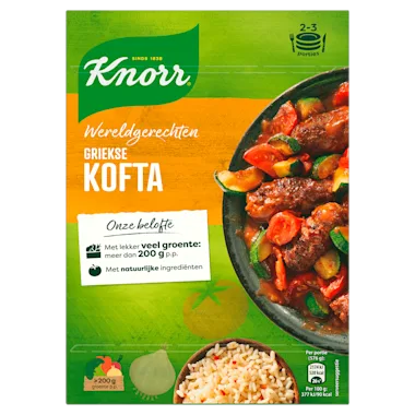 Met Knorr Wereldgerechten Griekse Kofta zet je gemakkelijk en snel een heerlijke maaltijd met lekker veel groente op tafel. Snel en eenvoudig te bereiden met op elk pak een alternatieve bereidingswijze zonder vlees of zelfs geheel vegan. Dit wereldgerecht bevat een rijstmix, een sausmix en een kruidenmix. Volg het recept met lekker veel groente en zet zo een maaltijd op tafel met minimaal 200 gram groente waar iedereen van geniet! Waan je even in de Griekse keuken met de heerlijke kruiden en smaken van deze Kofta.