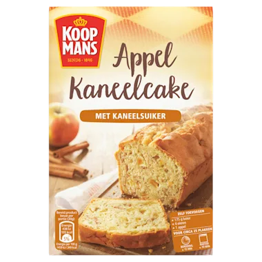 BENODIGHEDEN: 1 pak Koopmans Appelkaneelcake, 175 g roomboter of margarine, 4 eieren (M), 1 grote of 1½ kleine appel (bijv. Elstar of Jonagold) (alles op kamertemperatuur). KEUKENGEREI: Cakevorm van 30 cm, Mixer met gardes. OVENTEMPERATUUR: ELEKTRISCHE OVEN: 160°C, HETELUCHT OVEN: 150°C. MEESTE GESCHIKTE OVENSTAND: ELEKTRISCHE OVEN. BEREIDINGSTIJD: BEREIDING ±15 MINUTEN, BAKTIJD: 60-75 MINUTEN. VOORBEREIDEN: 1. Vet de cakevorm in met boter en bestuif de binnenkant met bloem of gebruik bakspray (bijv. Dr. Oetker). 2. Plaats het rooster iets onder het midden van de oven en verwarm de oven voor. 3. Schil de appel, verwijder het klokhuis en snijd de appel in kleine blokjes (0,5-1cm). BEREID HET BESLAG: 4. Klop de 175g boter met de mixer in een beslagkom zacht en romig. 5. Voeg de cakemix en de 4 eieren in één keer toe. 6. Klop het geheel met de mixer op de laagste stand in circa 1 minuut tot een glad beslag. 7. Klop het beslag daarna met de mixer op de hoogste stand in 2-3 minuten tot een luchtig beslag. 8. Voeg de appelstukjes en de kaneelsuiker aan het beslag toe en meng deze met een spatel door het beslag. BAKKEN: 9. Doe het beslag in de cakevorm en zet de cake direct in de oven. 10. Bak de cake in 60-75 minuten gaar en goudbruin. 11. Na 3-4 minuten kun je de bakvorm verwijderen en de cake verder laten afkoelen.