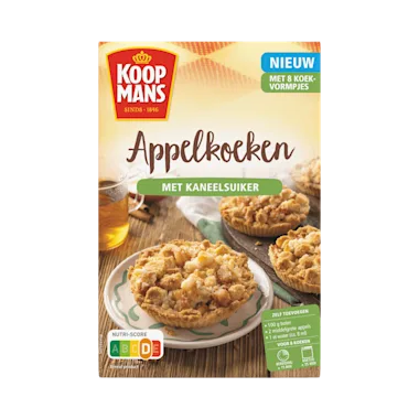 BENODIGHEDEN: 1 pak Koopmans Appelkoeken, 100 gram boter/margarine op kamertemperatuur, 2 middelgrote appels, 1 eetlepel water (ca. 8 ml). KEUKENGEREI: Mixer met gardes, Beslagkom. BEREIDINGSTIJD: BEREIDING: ± 15 MINUTEN. BAKTIJD: ± 35 MINUTEN. OVENTEMPERATUUR: ELEKTRISCHE OVEN 180°C AANBEVOLEN. HETELUCHT OVEN 170°C. VOORBEREIDEN 1. Zorg dat de boter/margarine op kamertemperatuur en zacht is. 2. Haal de bakplaat uit de oven en verdeel de koekvormpjes hierop. 3. Verwarm de oven voor op 180°C. BEREID DE APPELVULLING 4. Schil de appels, verwijder het klokhuis en snijd de appels in kleine blokjes (ca. 0,5 x 0,5 cm). 5. Meng in een mengkom de kaneelmix door de appelblokjes. BEREID DE APPELKOEKEN 6. Klop de boter met een mixer met gardes in een beslagkom zacht. 7. Voeg de koekmix en één eetlepel water toe en mix in ca. 2 minuten op middelste stand tot fijne kruimels. Kneed de kruimels vervolgens met de hand na om mooie grovere kruimels te verkrijgen. 8. Verdeel 3/4 van de kruimels over de koekvormpjes en houd 1/4 van de kruimels apart. 9. Druk de kruimels met je vingers aan en vorm zo een bakje met een rechtopstaand randje (± 0,5 cm). 10. Verdeel de appelvulling over de koekbodems. 11. Verdeel de resterende kruimels over de appelvulling. BAKKEN 12. Bak de Appelkoeken in ca. 35 minuten op 180°C goudbruin. 13. Laat de Appelkoeken goed afkoelen.