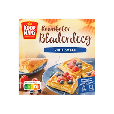 Met het Roomboter bladerdeeg van Koopmans kun je heerlijke zoete en hartige creaties maken en is eenvoudig te bewerken. Je begint met het kant-en-klare bladerdeeg, dat je alleen hoeft te laten ontdooien. Dan hoef je alleen nog de vulling te kiezen. Wat dacht je van bladerdeeghapjes met geitenkaas, of appelflappen met rozijnen?