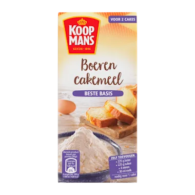 Benodigdheden - 225 g (1/2 pak) Koopmans Boerencakemeel - 225 g roomboter of margarine - 225 g suiker - 4 eieren - 30 ml melk Keukengerei - Cakevorm 30 cm - Mixer met garden - Beslagkom Bereidingstijd Ca. 20 minuten Baktijd 60 -70 minuten Voorbereiden 1. Plaats het rooster iets onder het midden van de oven en verwarm de oven voor. 2. Vet de cakevorm in met boter en bestuif de binnenknt met bloem of gebruik een bakspray (bijv. Dr. Oetker). Bereid het beslag 3. Klop de 225 g boter met de mixer in een beslagkom zacht en romig. 4. Voeg de 225 g suiker toe en meng het geheel tot een gladde massa. 5. Mix er één voor één de eieren door en klop het geheel gedurende circa 5 minuten op de hoogste stand tot een luchtig beslag. 6. Voeg het boerencakemeel (225g, 1/2 pak) en de melk in twee delen toe en meng het tot een glad geheel. Bakken 7. Doe het beslag in de cakevorm. 8. Bak de cake in 60-70 minuten gaar en goudbruin. 9. Zet de cake in de cakevorm op een rooster en laat de cake 10 minuten afkoelen. 10. Haal de cake uit de cakevorm en laat deze verder afkoelen op het rooster.