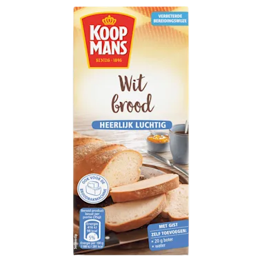 Benodigdheden voor de oven - 1 pak Koopmans Wit brood - 275 ml handwarm water - 20 g boter of margarine (kamertemperatuur) 1. Doe de mix en de boter in een beslagkom (houd eventueel één afgestreken eetlepel mix achter voor decoratie) en voeg de 275 ml water toe. 2. Kneed het geheel in circa 4 minuten met een mixer met deeghaken tot een soepel deeg. 3. Laat het deeg in de kom, afgedekt met vershoudfolie (of een theedoek), 10 minuten rijzen bij kamertemperatuur. 4. Bestrooi het aanrecht licht met bloem, druk het deeg plat of gebruik een deegroller en trek het uit tot een ovaal deegstuk. 5. Vouw de punten van het deeg naar binnen zodat ze elkaar raken en er een driehoek ontstaat. Druk dit weer plat (of gebruik een deegroller). 6. Rol het deegstuk stevig op tot een deegrol. 7. Als je het brood met de achtergehouden mix wilt decoreren, bestrijk het dan eerst met water. 8. Leg de deegrol met de naad naar beneden in een ingevet cakeblik (30 cm) of op een (ingevette) bakplaat (met bakpapier). 9. Leg een theedoek over de deegrol en laat het deeg op een warme (tochtvrije) plek 50 -60 minuten narijzen. 10. Verwarm 15 minuten voor het bakken de oven voor. 11. Bak het brood onderin de oven in circa 25 minuten gaar en bruin. Benodigdheden voor de broodbakmachine 1 pak Koopmans Wit brood 300 ml koud water 20 g boter of margarine Bereidingswijze voor de broodbakmachine 1. Doe de 300 ml koude water in de bakvorm 2. Voeg daarna de broodmix en de boter toe. 3. Stel de broodbakmachine in op het gewenste programma (bijv. normaal) en start het programma 4. Laat het gebakken brood afkoelen op een rooster.