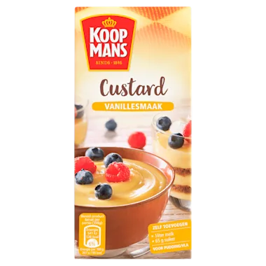 Met Koopmans Custard heb je een veelzijdige basis voor al je favoriete desserts. De romige smaak en gladde textuur maken het een onmisbaar ingrediënt in de keuken. Of je nu kiest voor een traditionele custardvla, een feestelijke pudding of een verfijnde fruittrifle, met deze mix creëer je in een handomdraai iets bijzonders. Zelfs voor een klassieke crème brûlée biedt het eindeloze mogelijkheden. Laat je inspireren en maak van elk dessert een smakelijk hoogtepunt!
