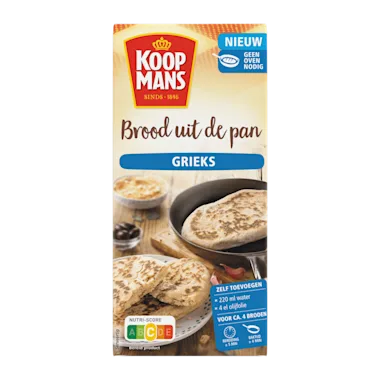 Met Koopmans brood uit de pan Grieks bak je, gewoon in de pan, in een handomdraai je eigen vers gebakken platbrood. Heerlijk voor bij de avondmaaltijd, bijvoorbeeld bij soep, maar ook geschikt voor bij de borrel met een lekkere Griekse tzatziki. Het platbrood is makkelijk te maken: voeg aan de broodmix alleen water en olie toe, kneed het deeg, verdeel het in 4 stukken en bak de broden kort in de pan. Genieten maar! Al sinds 1846 maakt Koopmans het Nederlandse gezinnen makkelijk om zelf iets lekkers te bakken. Vul je huis met de lekkerste geuren van zelfgebakken brood, cakes, taarten en koekjes. Koopmans, dan ben je thuis.
