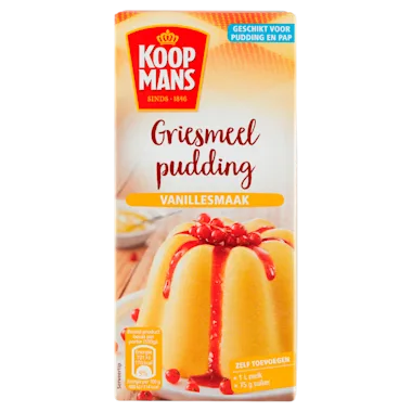 Met Koopmans Griesmeelpudding vanillesmaak maak je zelf ouderwets lekkere griesmeelpudding of -pap. In een handomdraai zet je de griesmeelpudding op tafel. Lekker met slagroom en vers fruit.