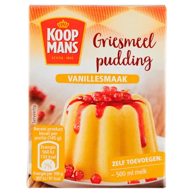 Met Koopmans Griesmeelpudding vanille maak je ouderwets lekkere griesmeelpudding met de lekkere smaak van vanille. In een handomdraai zet je de griesmeelpudding op tafel. Melk koken, met de griesmeel mengen en laten afkoelen. Lekker om te serveren met (geschaafde) amandelen en slagroom. Wil je liever griesmeelpap? Serveer de pap dan een paar minuten na het mengen.