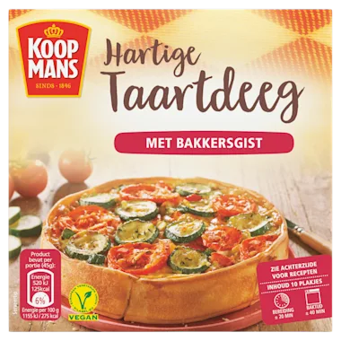 Benodigdheden voor hartige taart-courgettetaart (met kip) - 5-7 plakjes Koopmans Hartige taartdeeg - Optioneel: 270g kip - 2 tomaten - 1 courgette - 1 paparika - 1 ui - 100g geraspte kaas - Italiaanse kuiden - 100 ml melk - 3 eieren (M) -peper, kruiden en eventueel zout Keukengerei: - Springvorm of ovenschaal van doorsnede 22-25 cm - Mixer met gardes Bereidingstijd: Bereiding +/- 20 minuten Baktijd: 35-45 minuten Oventemperatuur: Elektrische oven: 180°C Hetelucht oven 160°C Voorbereiding: 1. Haal de bevroren eegplakjes van elkaar, verwijder de folie en laat de plaakjes eerst 5 tot 10 minuten ontdooien. 2. Plaats het rooster iets onder het midden van de oven en verwarm de oven voor. 3. Bekleed de ingevette springvorm of ovenschaal met 5 - 7 deegplakjes. 4. Snijd de paprika, ui 1 tomaat, halve courgette en kip in blokjes. 5. Snijd de overige tomaat en de rest van de courgette in plakjes Bereid de vulling 6. Verhit wat olie in een koekenpan en bak de kip gaar. Voeg vervolgens de gesneden ui en courgette toe en als laatst de paprika en tomaat. Bak alles kort. Voeg naar smaak peper, zou en Italiaanse kruiden toe. 10. Klop het geheel 1 minuut met de mixer met gardes op de middelste stand en schenk het over de taartvulling. 11. Verdeel de rest van de kaas en de plakjes tomaat en courgette over de taart. Bakken 12. Bak de hartige taart in 35-45 minuten gaar en goudbruin.