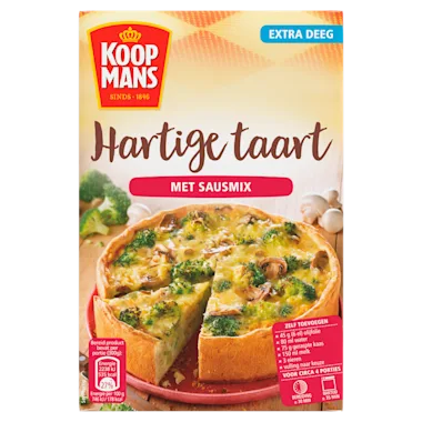 Met de Koopmans mix voor hartige taart maak je het direct gezellig in huis. Geniet van de brosse bodem en de zachte, hartige vulling. Wat ga jij toevoegen aan de hartige taart? De mogelijkheden zijn eindeloos. Kies je favoriete verse ingrediënten en maak elke keer een heerlijke creatie. Of je nu gaat voor kleurrijke groenten, smaakvol vlees, verse vis of verschillende soorten kaas, met de Koopmans mix voor hartige taart zet je iedere keer een heerlijke groentetaart of quiche op tafel. Perfect voor een doordeweekse maaltijd of een feestelijk diner.