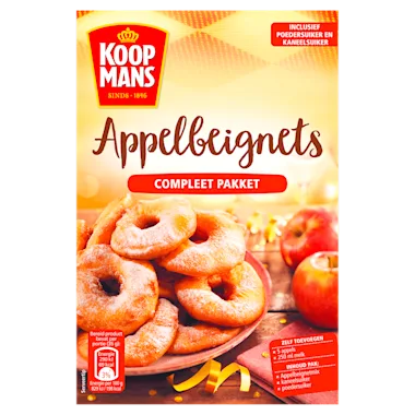 Koopmans Appelbeignets zijn eenvoudig te maken en ook erg lekker. Dit pakket bevat bijna alles wat je nodig hebt. Appels en melk erbij en je traktatie voor de feestdagen (of gewoon zomaar!) is klaar. Lekker bij een glaasje champagne tijdens Oud & Nieuw of bij een lekker kopje koffie. Al sinds 1846 maakt Koopmans het Nederlandse gezinnen makkelijk om zelf iets lekkers te bakken. Vul je huis met de lekkerste geuren van zelfgebakken taart, cakes, brood en koekjes. Koopmans, dan ben je thuis.