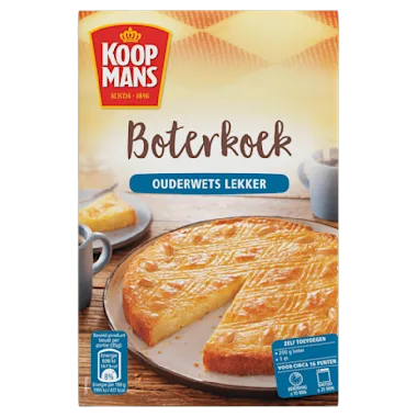 Benodigdheden - 1 pak Koopmans Boterkoek - 200g roomboter - 1 ei (M) (alles op kamertemperatuur) Oventemperatuur: Elektrische oven 180°C Keukengerei: - Boterkoekvorm of springvorm doorsnede 24 cm - Mixer met deeghaken Voorbereiden 1. Plaats het rooster in het midden van de oven en verwarm de oven voor. 2. Vet de vorm in met boter of gebruik een bakspray (bijv. Dr. Oetker). 3. Klopt het ei los in een kommetje. Bereid het beslag 4. Mix met de mixer met deeghaken de 200g roomboter zacht in een beslagkom. Voeg daarna de boterkoekmix en 2/3e van het losgeklopte ei toe en kneed het geheel met een mixer met deeghaken of met de hand tot een samenhangend deeg. 5. Doe het deeg in de bakvorm en verdeel het deeg met de bolle kant van een natte lepel over de vorm. 6. Bestrijk het deeg met de rest van het losgeklopte ei. 7. Trek met een vork schuine lijnen in het deeg, zodat een ruitpatroon ontstaat. Bakken 8. Bak de boterkoek in circa 25 minuten gaar en goudbruin. 9. Laat de boterkoek circa 1 uur afkoelen, voordat je hem uit de vorm haalt.