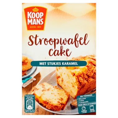 Benodigdheden: 1 pak Koopmans Oud-Hollandse Stroopwafelcake, 200 g roomboter of margarine, 4 eieren (middelgroot), 4 stroopwafels (alles op kamertemperatuur) Oventemperatuur: Elektrische oven: 160 graden Bereidingswijze 1. Plaats het rooster iets onder het midden van de oven en verwarm de oven voor. 2. Vet de cakevorm in met boter en bestuif de binnenkant licht met bloem. 3. Klop de boter met de mixer in een beslagkom zacht en romig. 4. Voeg de cakemix en eieren in één keer toe. 5. Roer het geheel met de mixer op de laagste stand in ½ minuut tot een glad geheel. 6. Klop het beslag daarna met de mixer op de hoogste stand in 2 minuten tot een luchtig beslag. 7. Snijd 2 stroopwafels in kleine stukjes van ca. 1 cm en meng deze met een spatel door het beslag. 8. Doe het beslag in de cakevorm en strijk het beslag glad. 9. Snijd de overige 2 stroopwafels in kleine stukjes van 1 cm en verdeel deze over de cake. 10. Bak de cake in circa 60 - 70 minuten gaar en goudbruin. 11. Zet de cake in het blik op een rooster, leg een theedoek over de cake en laat de cake 30 minuten afkoelen in het blik. 12. Haal de cake uit de vorm en laat deze op een rooster goed afkoelen. 13. Pas als de cake volledig is afgekoeld, kun je deze voorzichtig aansnijden met een groot mes met fijne kartels (broodmes).