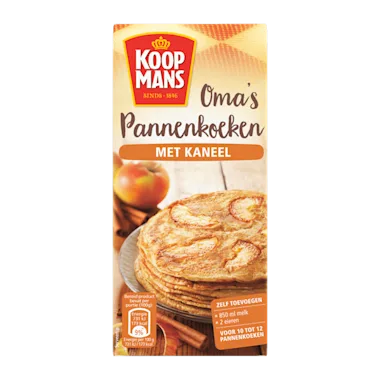 BENODIGDHEDEN · 1 pak Koopmans Oma's Pannenkoeken Kaneel · 850ml melk · 2 eieren · Boter of olie. KEUKENGEREI · Mixer of garde. BEREIDINGSTIJD ± 30 minuten BEREID HET BESLAG 1. Doe de mix in een beslagkom en voeg de helft van de melk toe (circa 425 ml). 2. Roer het geheel met een garde of mixer tot een glad beslag. 3. Voeg al roerend de rest van de melk en de 2 eieren toe. BAKKEN 4. Doe een klontje boter of scheutje olie in een koekenpan en laat de pan goed heet worden. 5. Giet wat beslag in de pan, laat het uitlopen over de bodem en bak de pannenkoeken op niet al te hoog vuur aan beide zijden goudbruin.