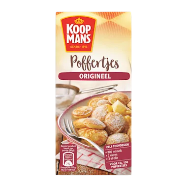 Koopmans poffertjes zijn er om met het hele gezin van te genieten. Bak deze heerlijke mini pannenkoekjes als lunch of avondeten en geniet met z'n allen van een lekkere traktatie. De Koopmans poffertjesmix is eenvoudig te maken en kan bijna niet mislukken. Het Oer-Hollandse recept maakt deze poffertjes extra lekker en geeft ze een authentieke smaak. Serveer de poffertjes met roomboter en poedersuiker voor de klassieke ervaring of experimenteer met andere toppings zoals slagroom, vers fruit en chocolade.