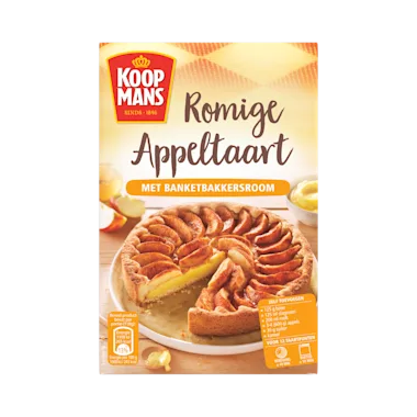 Lekker én makkelijk: deze romige appeltaart van Koopmans. Deze heerlijke traktatie heeft een knapperige bodem en een romige vulling van banketbakkersroom. Maak je taart af met daaroverheen appels en pure verwennerij staat voor je klaar. Wist je dat je deze taart ook met rabarber, rood fruit, peer of slagroom kan maken? Aan jou de keus. Met wie ga jij van deze taart genieten?