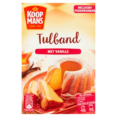 Ingrediënten: Tulbandmix (450 g): Suiker, TARWE-BLOEM, TARWEZETMEEL, zetmeelmengsel, rijsmiddelen (E500, E575, E450), emulgatoren (E475, E471), natuurlijk vanille aroma, gemalen vanillestokjes, verdikkingsmiddel (xanthaangom). Poedersuiker (15 g): Poedersuiker, antiklontermiddel (E341). Kan El en MELK bevatten.