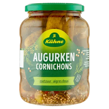 Ingrediënten: Augurken, natuurazijn, glucose-fructosestroop, zout, suiker, dille, uien, rode paprika, MOSTERDZAAD, natuurlijk aroma