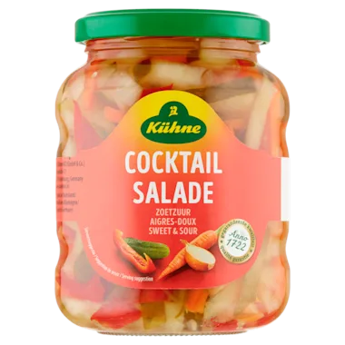 Ingrediënten: Augurken, rode paprika's, uien, natuurazijn, wortelen, gele paprika's, glucose-fructosestroop, KNOLSELDERIJ, suiker, zout, natuurlijk aroma