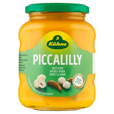 Ingrediënten: Water, groenten 23% (zilveruien, augurken, bloemkool), natuurazijn, suiker, TARWEBLOEM, MOSTERDZAAD, zout, raapzaadolie, curcuma, specerijen