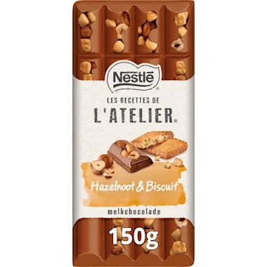 NESTLÉ L'ATELIER Melkchocolade met Hazelnoot & Biscuit is een romige kwalitatieve chocolade met zichtbare ingredriënten. Zichtbaar genieten.
