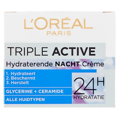 Triple Active Nachtcrème is verrijkt met Glycerol en garandeert een optimale hydratatie. Gedurende de nacht ontspant de huid zich en kalmeert ze om fris te zijn bij het wakker worden. De intense werking helpt de beschermende barrière van de huid te herstellen. Geschikt voor alle huidtypen en leeftijden.