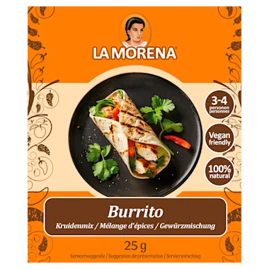 Recept voor 3-4 personen. Benodigheden: 400-500 g kip en/of paddenstoelen, 1x La Morena burrito kruidenmix, 1 avocado, 1 pak La Morena tortillawraps, 1 blik La Morena refried beans, 125 g sour cream, La Morena Chipotle saus. Bereidingswijze: 1. Snijd de kip/paddenstoelen in kleine stukjes. Verhit een wok of hapjespan en bak hierin de kip/paddenstoelen rondom bruin. Voeg de kruidenmix en een scheut water toe en laat 5.min. sudderen. 2. Snijd het vruchtvlees van de avocado in kleine blokjes. 3. Verwarm de tortilla’s volgens de aanwijzing op de verpakking en besmeer de tortilla met de refried beans. 4. Verdeel in het midden van de tortilla de kip/paddenstoelen, guacamole, zure room en chipotle saus. Vouw de onderkant van de tortilla naar binnen en vervolgens de zijkanten. Rol de tortilla volledig op tot een burrito. Serveer met saus en zure room naar smaak.