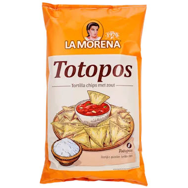 Lekker als snack. Wat zijn totopos? Totopos is de Mexicaanse naam voor tortilla chips. Vroeger werden overgebleven tortilla’s klein gesneden en knapperig gebakken. Lekker als snack. Hoe kun je totopos gebruiken? 1. Dip ze in een heerlijke salsa of dip van La Morena als snack. 2. Gebruik ze als topping in soep of salade voor een knapperige bite. Verkruimel de totopos en verdeel over je Mexicaanse gerecht. 3. Maak er het gerecht nachos mee! Lekker in combinatie met de bonenspreads en pepers van La Morena.