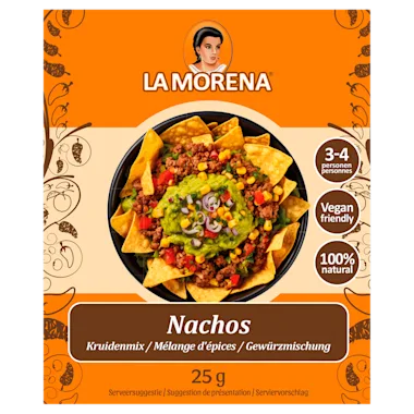 Recept voor 3-4 personen. Benodigdheden: 1x La Morena nacho kruidenmix, 475 g La Morena Totopos, 300 g (vegetarisch) gehakt, 1 blik La Morena refried beans, 2 tomaten, La Morena Jalapeño nacho slices, naar smaak, 200 gram geraspte kaas, La Morena salsa naar keuze. Bereidingswijze: 1. Verhit een wok of hapjespan en bak hierin het gehakt rul tot het vocht is verdwenen. Roer de kruidenmix door het gehakt en bak 1 minuut roerend mee.