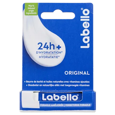 Labello Original biedt intense voeding voor je lippen, waardoor ze zacht en soepel aanvoelen. Deze snel absorberende formule met natuurlijke oliën en Sheaboter zorgt voor 24 uur hydratatie* die helpt om droogheid en barsten te voorkomen. Geniet van dagelijkse lipverzorging met Labello.