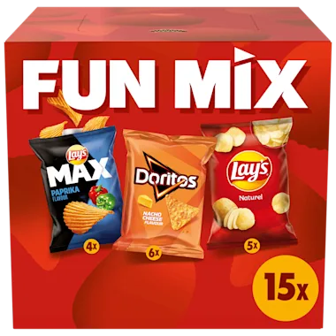 FUN MIX. Geniet samen met je familie van jullie favoriete Lay's® & Doritos® snacks, speciaal geselecteerd voor deze Fun Mix. De kleine zakjes zijn handig om uit te delen en lekker als tussendoortje, op elke moment van de dag. Nu verkrijgbaar in een handige kartonnen box. Eenvoudig mee te nemen en makkelijk op te bergen. Ontdek alle boxen en vind jouw favoriet; Classix Mix, Fun Mix, Mega Box.