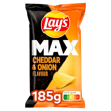 Lay’s MAX Cheddar & Onion zijn heerlijke geribbelde aardappel chips met krachtige smaak met de heerlijke smaakcombinatie van kaas- en uismaak. MAX crunch, MAX taste!