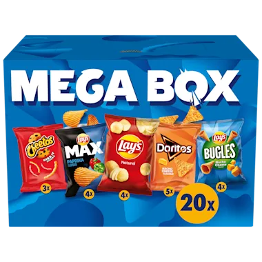 Geniet samen met je familie van jullie favoriete Lay's® & Doritos® & Cheetos® snacks, speciaal geselecteerd voor deze Mega Box. De kleine zakjes zijn handig om uit te delen en lekker als tussendoortje, op elke moment van de dag. Nu verkrijgbaar in een handige kartonnen box. Eenvoudig mee te nemen en makkelijk op te bergen. Ontdek alle boxen en vind jouw favoriet; Classix Mix, Fun Mix, Mega Box.