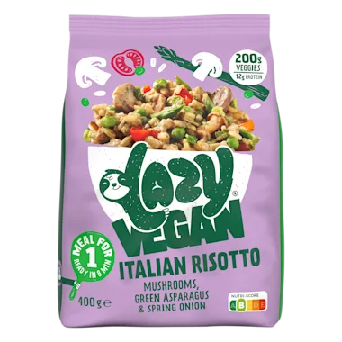 gekookte arborio rijst 37% (water, rijst), champignons 12%, cherry tomaten 9%, doperwten 9%, groene asperges 7%, lente-ui 7%, kokosmelk 7% (kokosnootextract, water), eekhoorntjesbrood 3%, bloemkool 3%, aardappelzetmeel, peterselie, knoflook, kokosolie, kikkererwtenmeel, erwtenvezel, edelgist, raapzaadolie, ui, tomaat, wortel, zout, suiker, natuurlijke aroma's, zwarte peper.