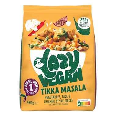 Maaltijd met gemengde groenten en peulvruchten (56%), gekookte rijst, op erwteneiwit gebaseerde stukjes en Tikka Masala kruiden. Diepvries.