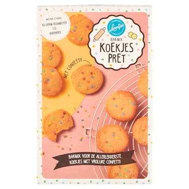 TARWEbloem, suiker, 9% suikerdecoratie (suiker, water, zonnebloemolie, aardappelzetmeel, rijstebloem, saffloerextract, natuurlijk vanille aroma, spirulina, rammenas, zwarte bes, appels, citroen), gedroogde glucosestroop, rijsmiddelen (E450, E500), zout, natuurlijk aroma, Kan EI bevatten.