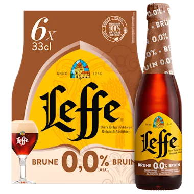 Leffe Bruin 0.0 is een abdijbier met een diepe, herfstbruine kleur en een volle, lichtzoete smaak, beiden te danken aan de donkergebrande mout.
